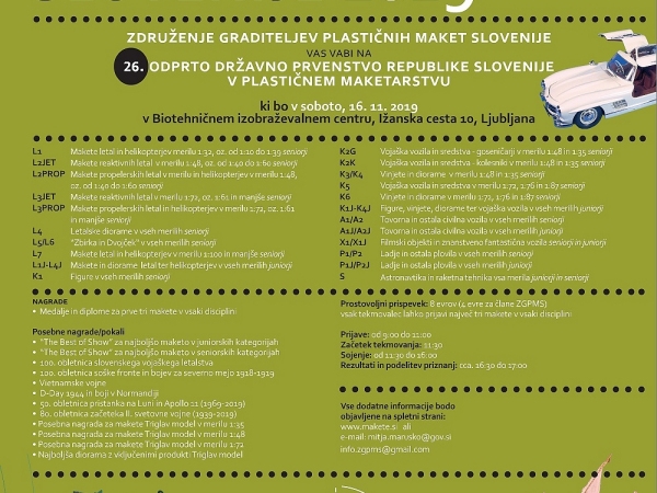 ZDRUŽENJE GRADITELJEV PLASTIČNIH MAKET SLOVENIJE Vas Vabi na 26. ODPRTO DRŽAVNO PRVENSTVO REPUBLIKE SLOVENIJE V PLASTIČNEM MAKETARSTVU ki bo 16.11.2019 v Biotehničnem izobraževalnem centru, Ižanska cesta 10, Ljubljana